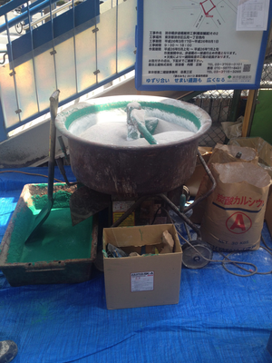 The sand dumped out a hole in the bottom of the mixer and they hauled it upstairs in bags